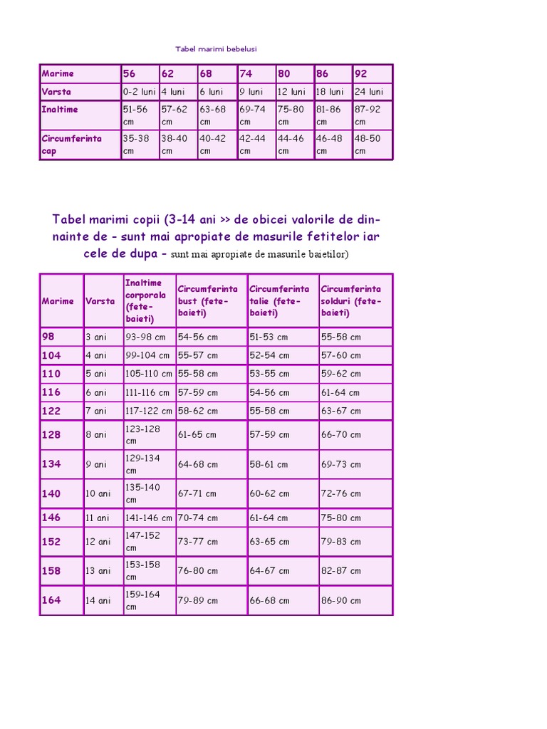 Tabel Marimi Copii