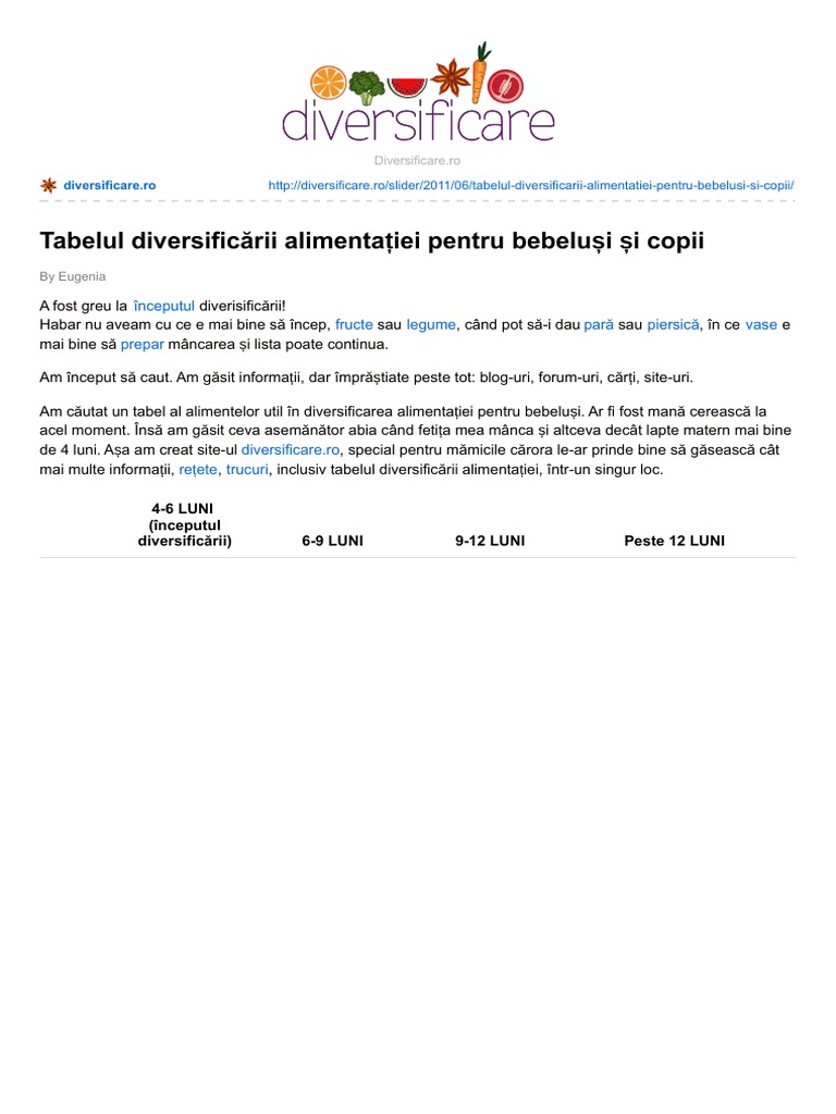 Diversificare Ro Tabelul Diversificării Alimentației Pentru