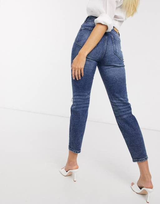 Stradivarius Ripped Slim Mom Jeans With Stretch In Blue Wash Asos